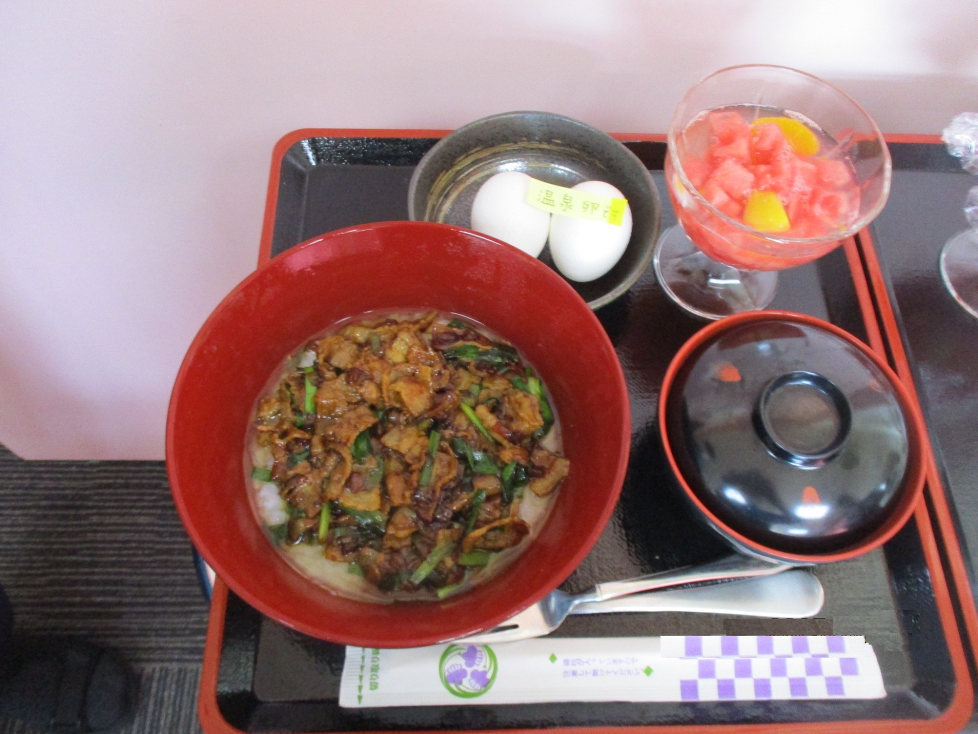 栄養課が用意したスタミナ丼とスイカのフルーツポンチをご用意!!