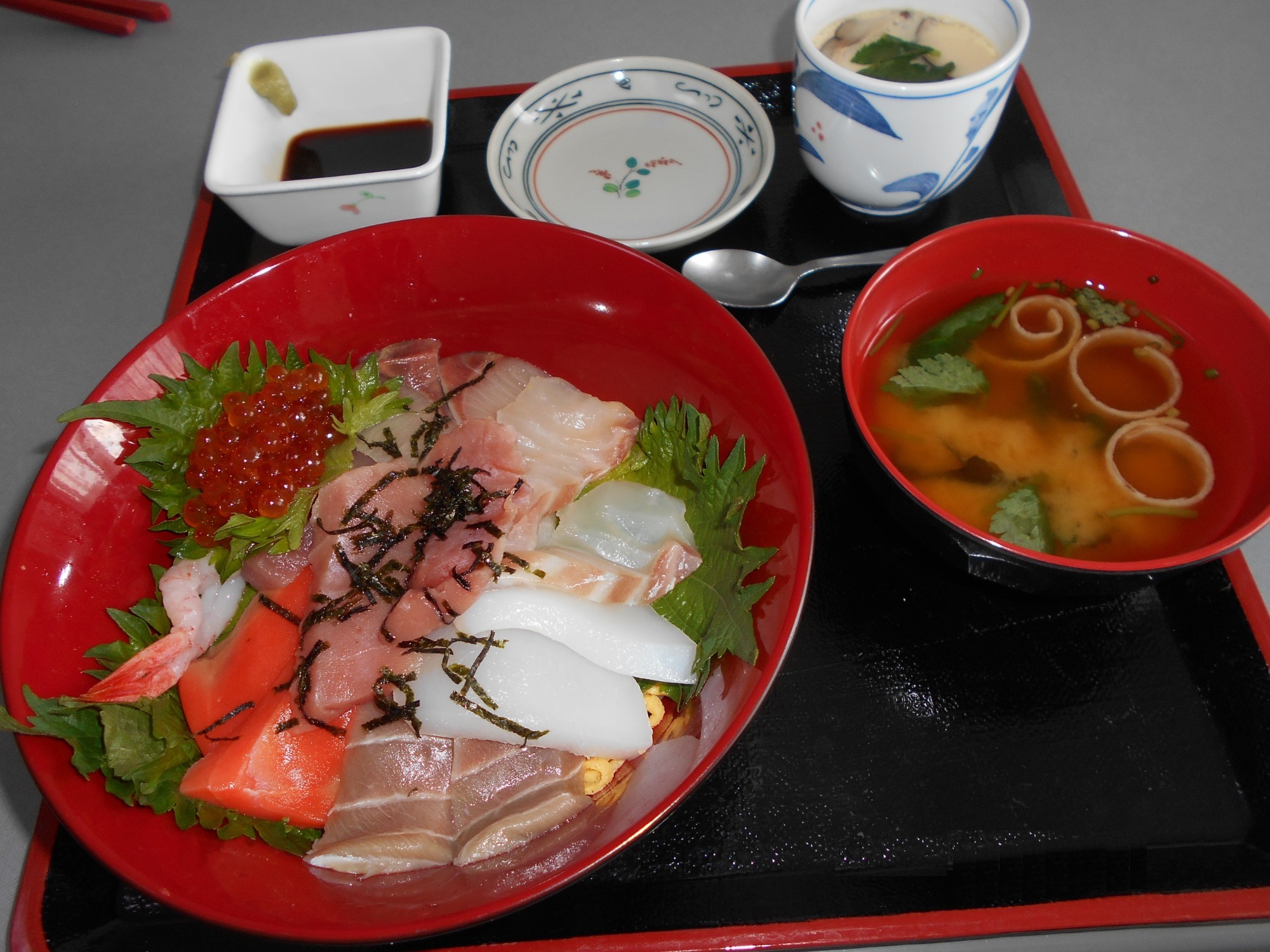 海鮮ちらし寿司とプリンに各種トッピングをお出しすると、