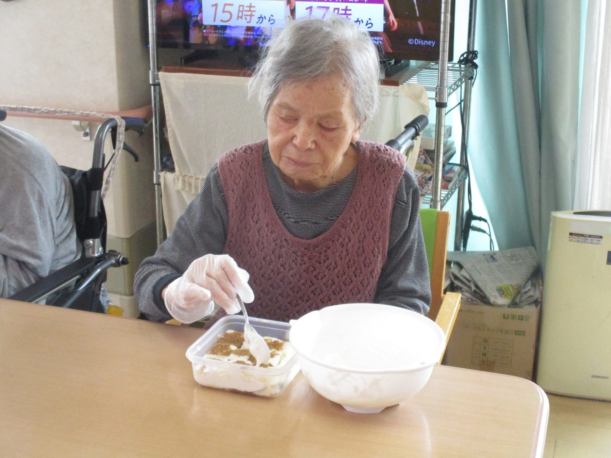 今回は、入居者のみなさんと食パンでティラミスを作りました。