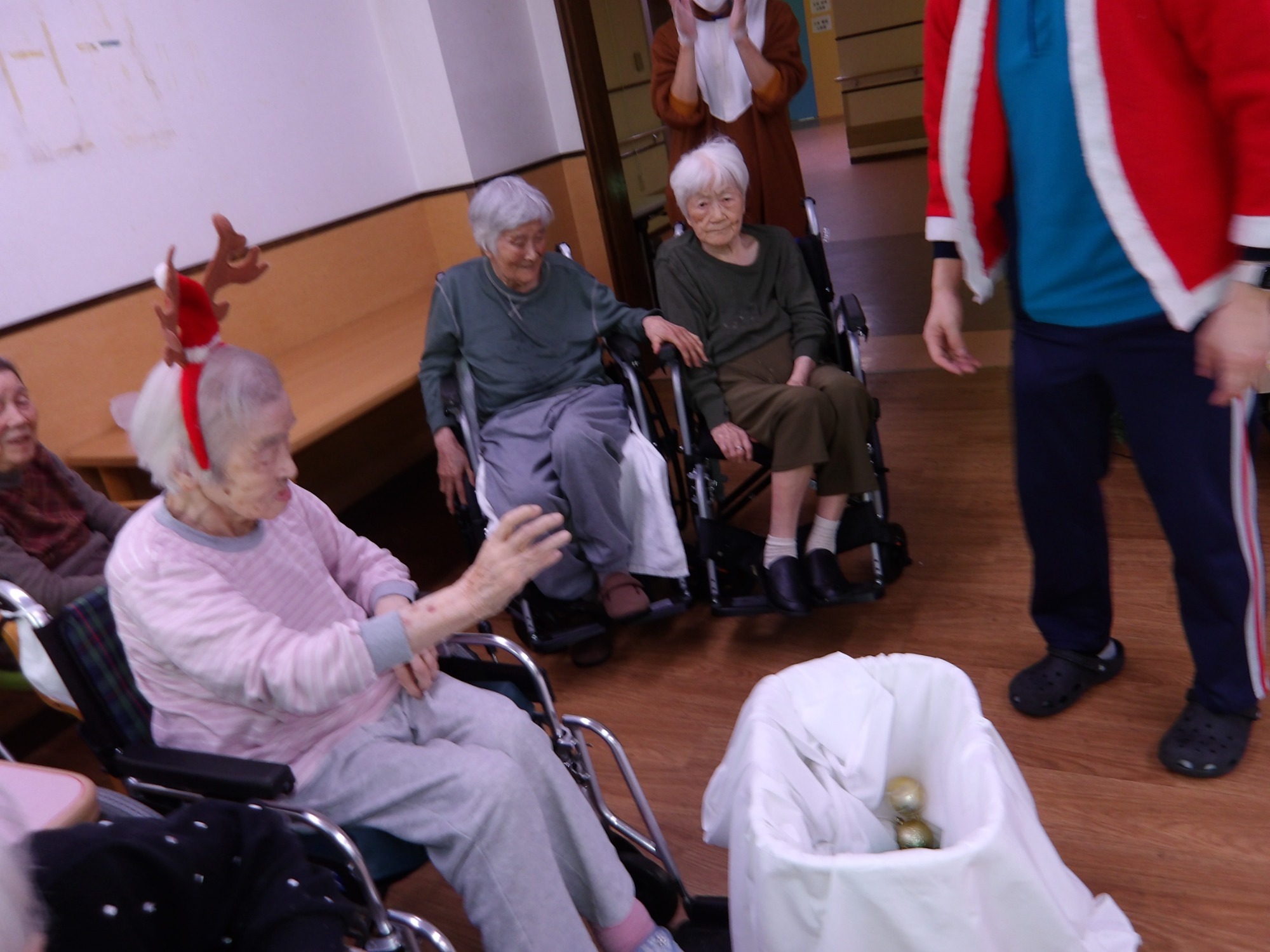 今回は入居者の皆さんに季節を感じていただきたくクリスマスレクリエーション(玉入れ)を行いました。