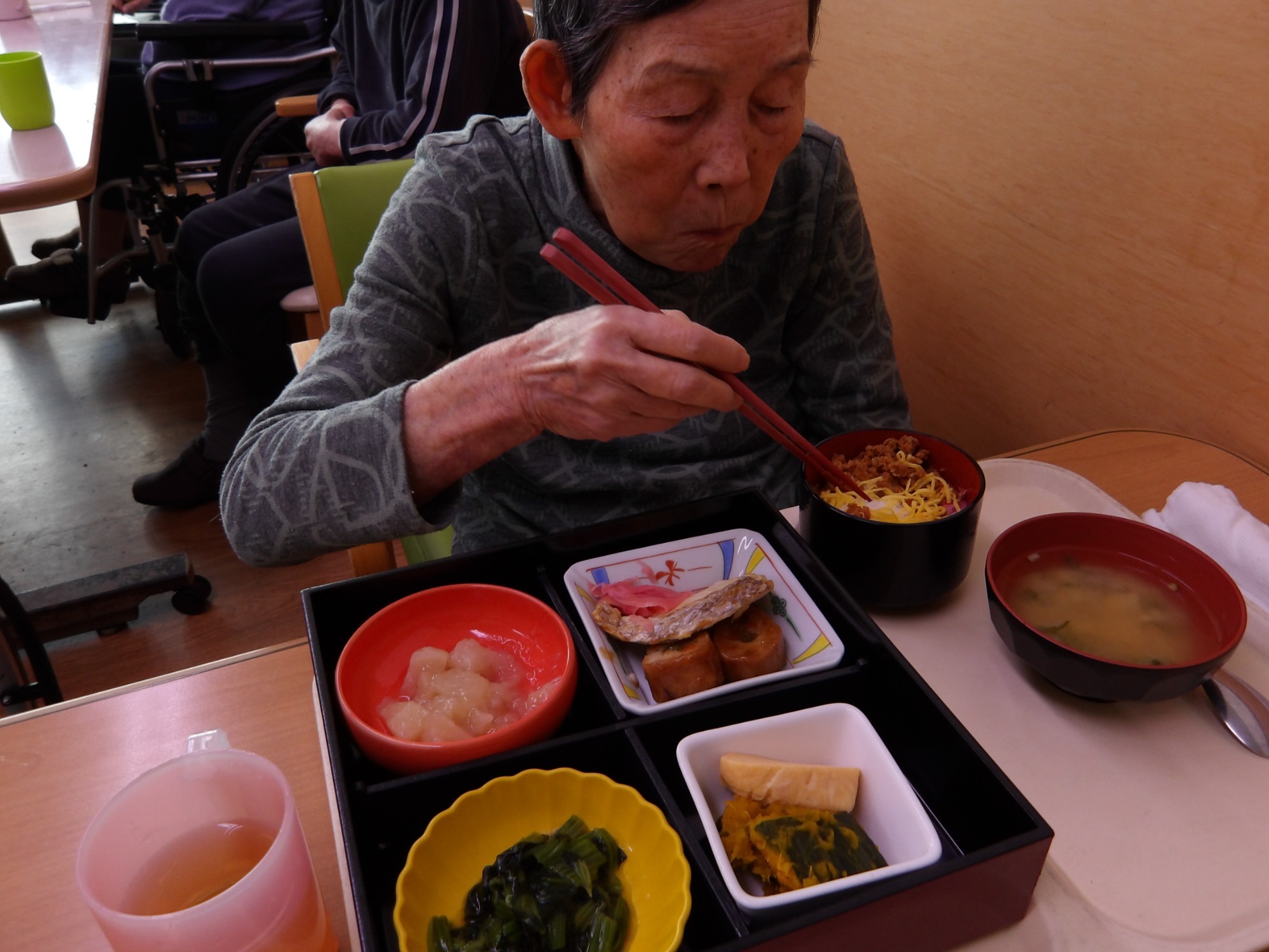 何とか好きな物を食べて頂けないかと栄養課に相談し、鯛の刺身を細かく刻んで提供などをしています。