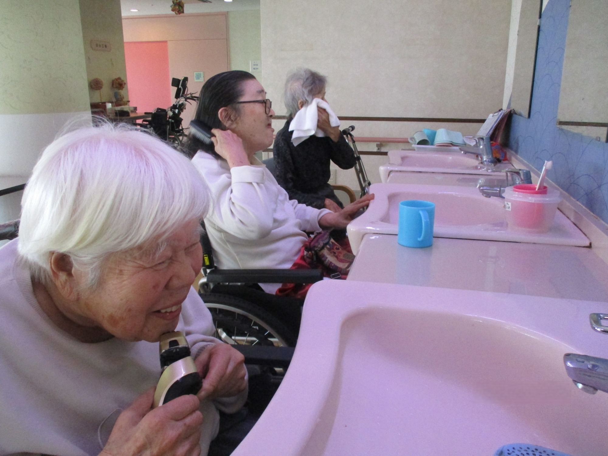 毎日欠かさず、朝起きて鏡の前で決まってする事がある入居者3人様です。