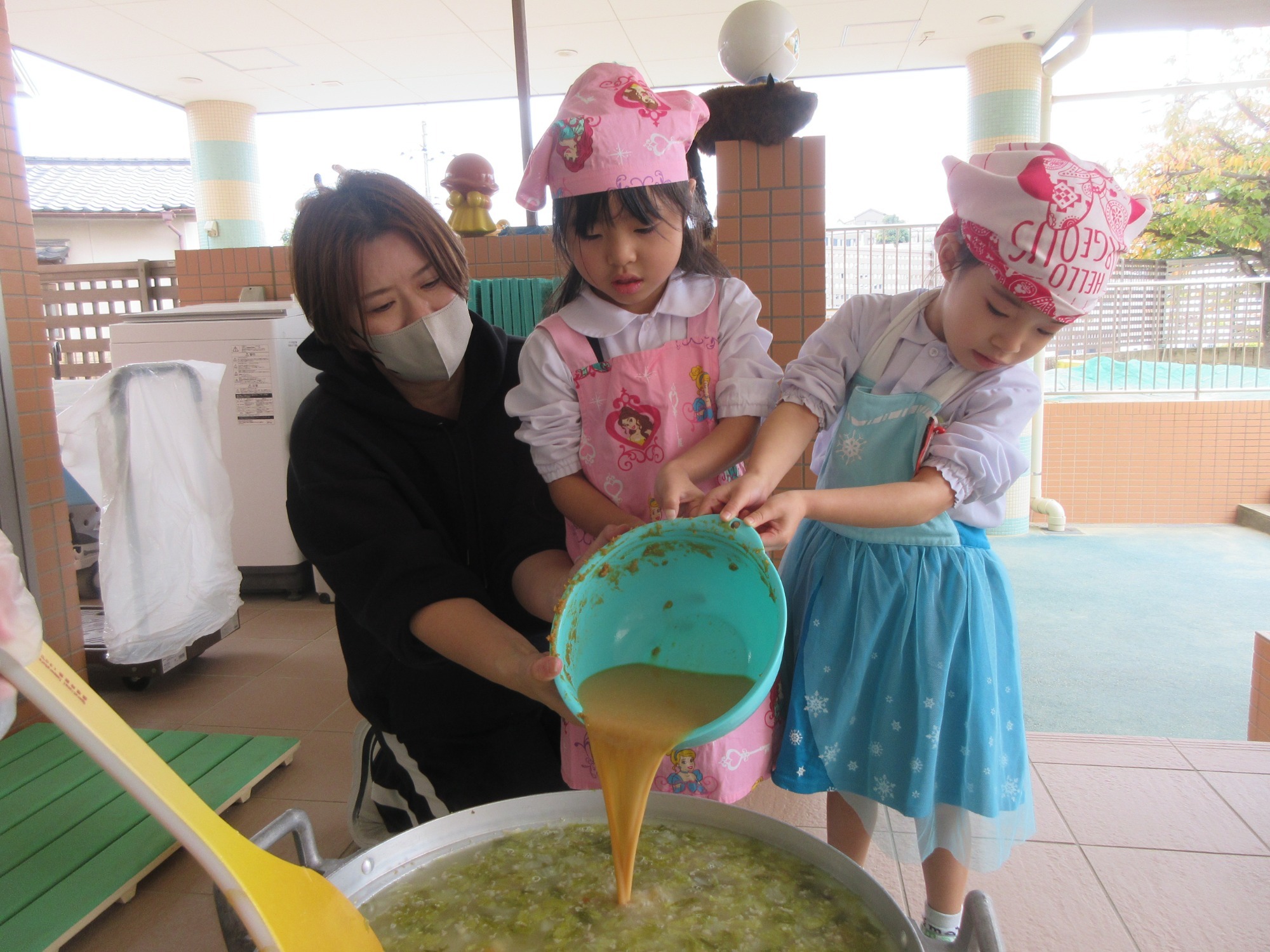 幼児クラスが手作りスライダーで遊ぶイベントに給食室もおやつ提供として参加しました!