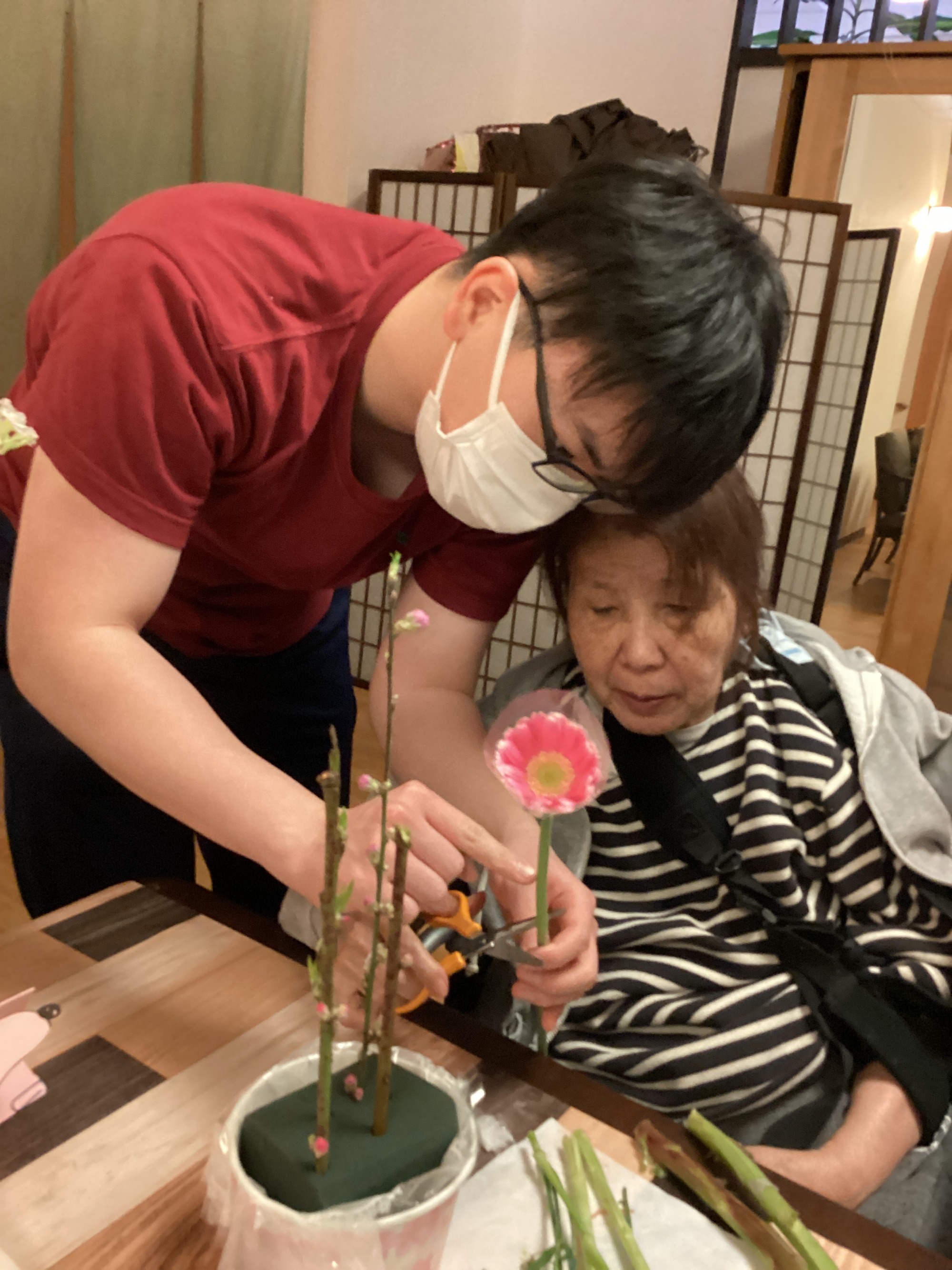 今回は生花を使用し、好きな長さに切り飾っていくという工程を職員と共に行いました。